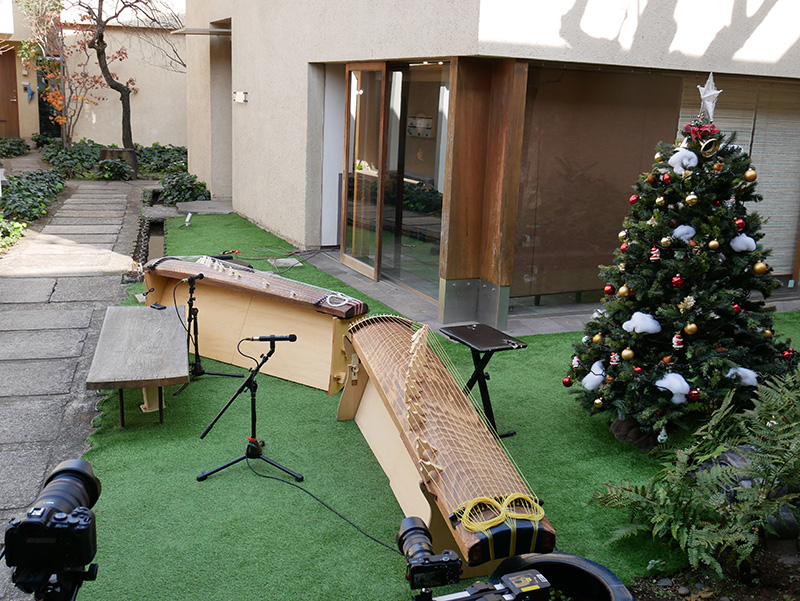 さすがに古典曲の演奏にクリスマスツリーが映るのはあまりよろしくないということで、それを隠す方法に苦戦しました。室内に御簾を下げてもどうしても透けて見えてしまいます。最初は黒い幕で覆いましたが、中から見ると人ならぬものが立っているように見えて結構不気味です。