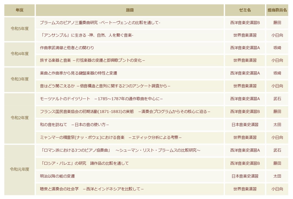 3年次にゼミナールに参加し、音楽学のさまざまな分野に触れ、また実際に自分で研究や発表をしながら、4年次に作成する論文の内容を決めていきます。