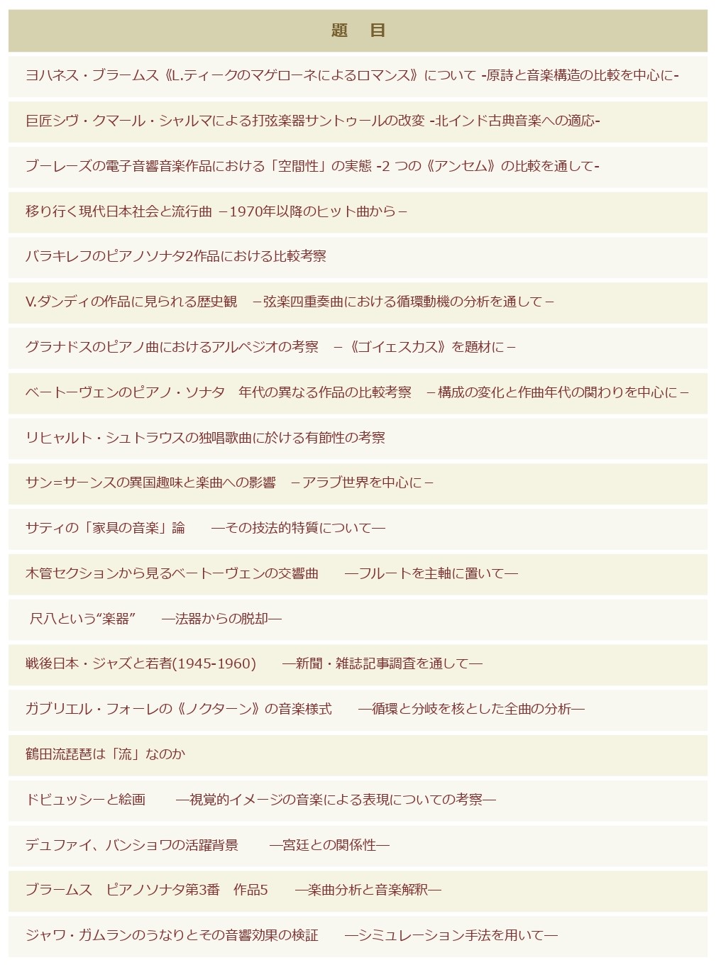 音楽学課程では良い経験がたくさんできましたが、一番大きかったのはやはり卒論を書いたことです。卒論ではレポートのように他人の言っていることをまとめるだけでなく、自分はどう考えるかを述べなければなりませんが、卒論の準備を始めてみて、ある事柄について論文にできるほどの自分の意見を持つということは本当に大変なことだと分かりました。指導してくださった先生にも何度も言われたことですが、答えを出すには地味で地道な作業を積み重ねていくしかありません。私の場合はピアノソナタの分析をしたのですが、分析は1度だけでなく何度も見直しや変更をしましたし、個々の曲や作曲された時期ごとの、またはピアノソナタ全体における特徴を見出すために、比較などのいろいろな作業をしました。すべての作業が卒論に反映されたわけではなく、結果的に無駄になったこともあります。しかし、実際に取り組んでみて、様々な作業を地道に積み重ね、失敗もして初めて自分なりの答えが見えてくるのだと分かりました。卒論完成までの道のりは順調なものではなく、寄り道をすることもあれば、先が見えずに手探りで進んでいく苦しいときもありましたが、書き上げた後の達成感は何物にも代えがたいです。一つのことをじっくり追求したい人、専攻以外にも何かを頑張りたい人は、是非音楽学課程に挑戦してほしいと思います。