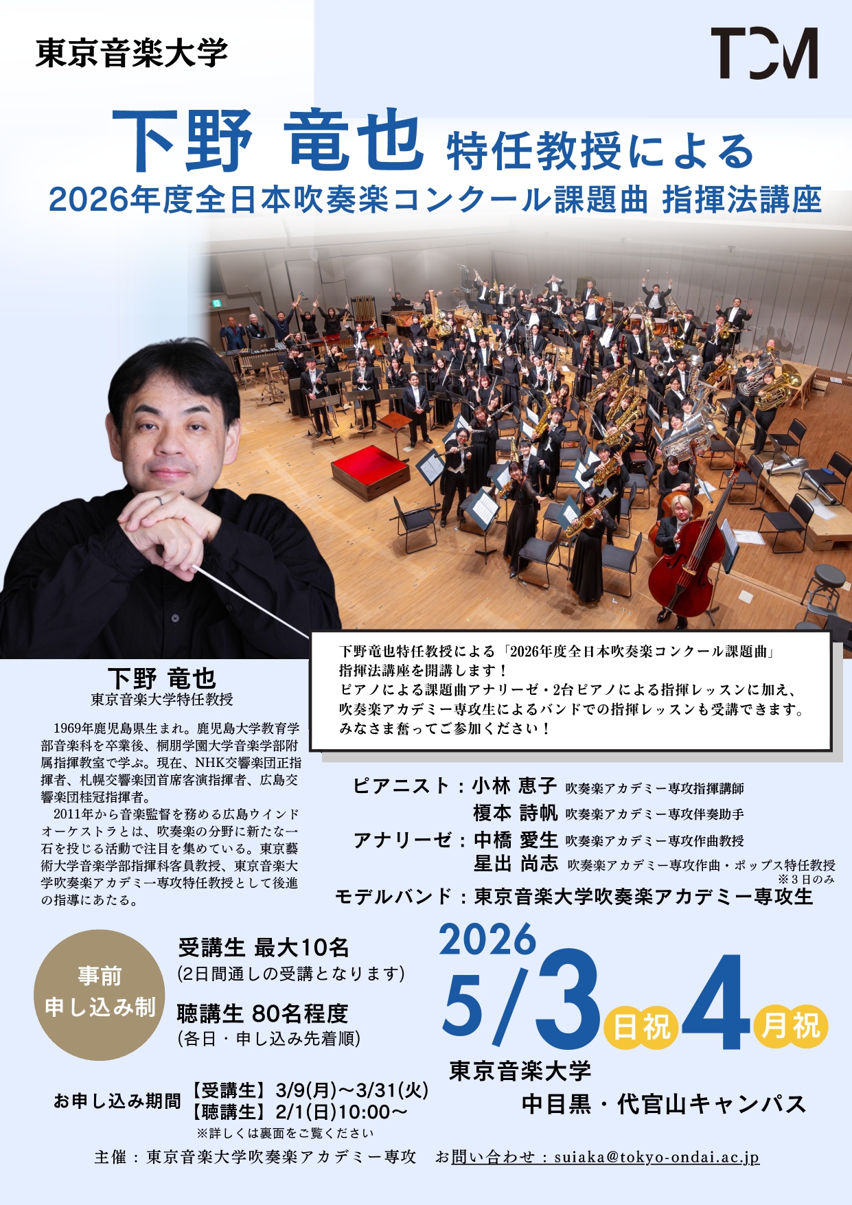 アナリーゼ:中橋 愛生(吹奏楽アカデミー専攻 作曲教授)、星出 尚志(吹奏楽アカデミー専攻 作曲・ポップス特任教授)※3日のみ
