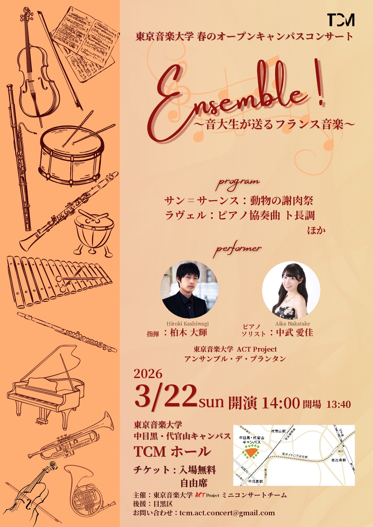 本公演では、七重奏や、11名編成による動物の謝肉祭、学生編曲によるラヴェルのピアノ協奏曲など、多彩な編成・作品によるアンサンブルをお届けします。どの専攻の皆さまにもお楽しみいただけるプログラムになっております。
