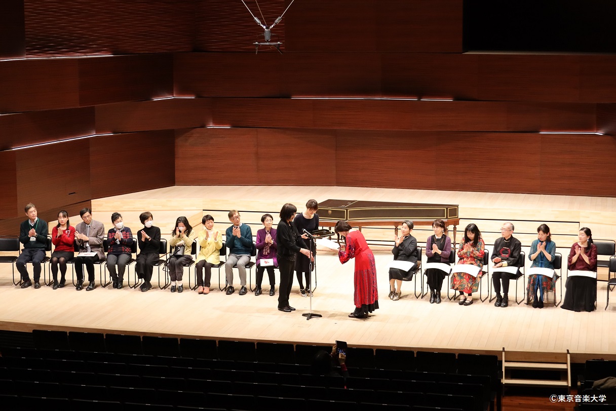 「全員合格です。おめでとうございます。この講座を受講する社会人のみなさんは、まだ1年目の方から5年間通い続けている方までいらっしゃいます。曲選びのために付属図書館をフル活用して楽譜を調べて今日のために準備をしてきたと聞いています。みなさんそれぞれご自身の成果を出せたのではないでしょうか。本学が昨年、中目黒・代官山に新しいキャンパスを開校して、このTCMホールで今日はじめて民族楽器の演奏が行われました。TCMホールができた時から、民族音楽がここで鳴り響くのを楽しみにしていました。みなさんにとって、生涯大きな思い出となったのではないでしょうか。これからもこのホールから発信する、幅広い世界の音楽をたくさんの方々に楽しんでいただきたいと思います」(加藤所長)