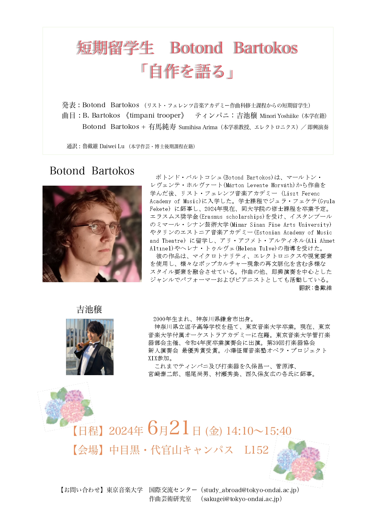 A concert “Botond Bartokos Talks on His Compositions” was held on June 21, 2024, featuring an exchange student Botond Bartokos from Liszt Ferenc Academy of Music.