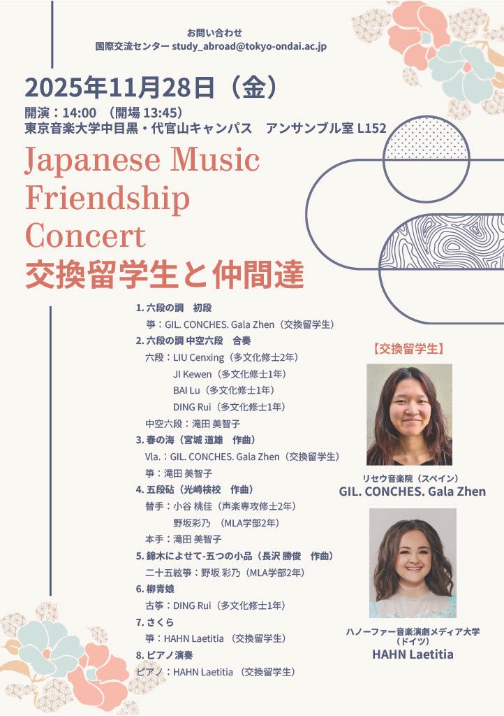 Gala Zhen GIL CONCHES from the Liceu Conservatory in Spain, and Laetitia HAHN from Hannover University of Music, Drama and Media in Germany, gave a koto concert with 6 current students on November 28, 2025. Gala performed two pieces: Rokudan no Shirabe (six-column tune) on koto and Haru no Umi (the sea in spring) on the viola with her koto teacher, Michiko TAKITA. Laetitia performed two pieces: Sakura (cherry blossom) on the koto and Liszt: Ballade No.2 on the piano.