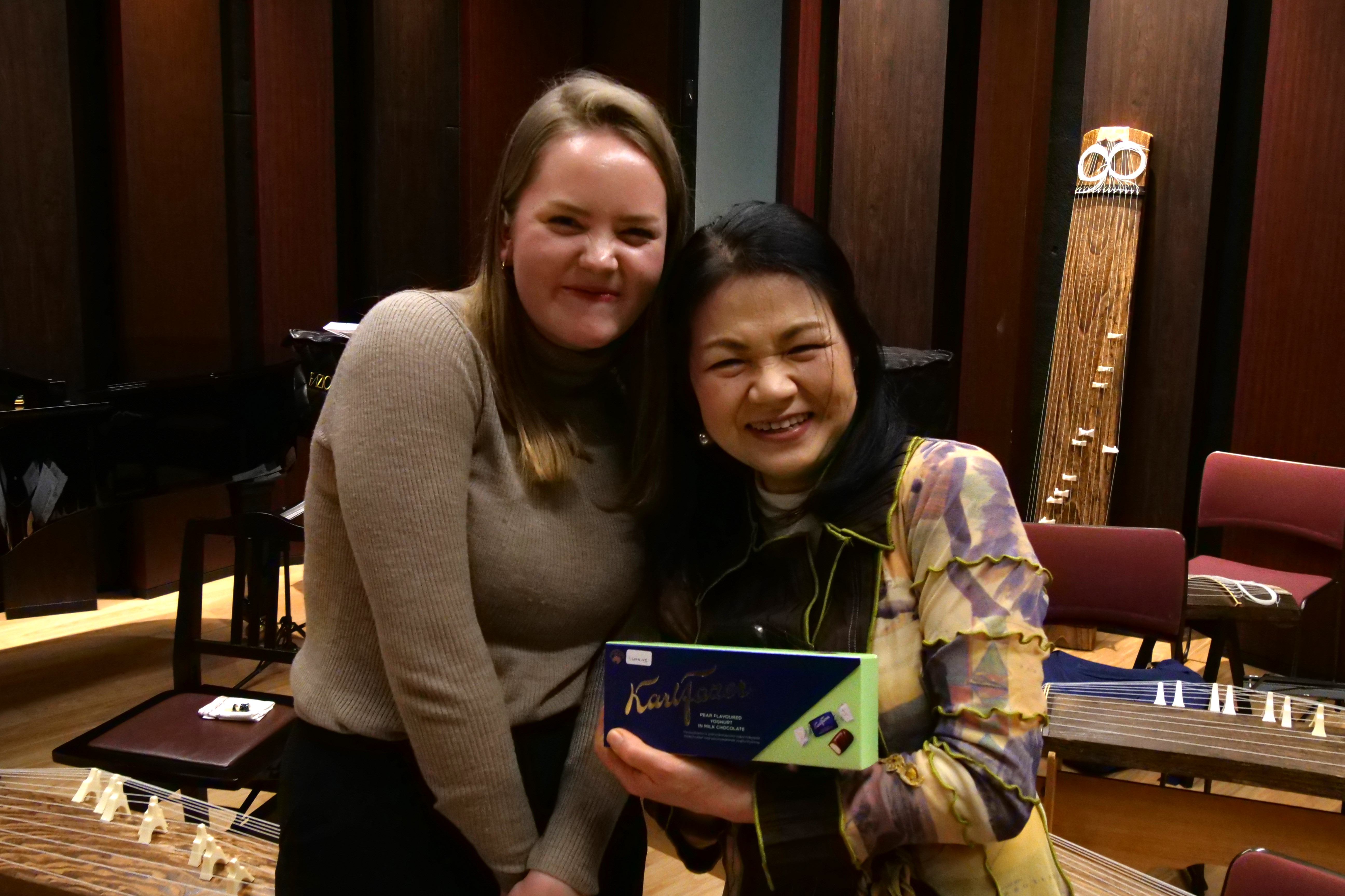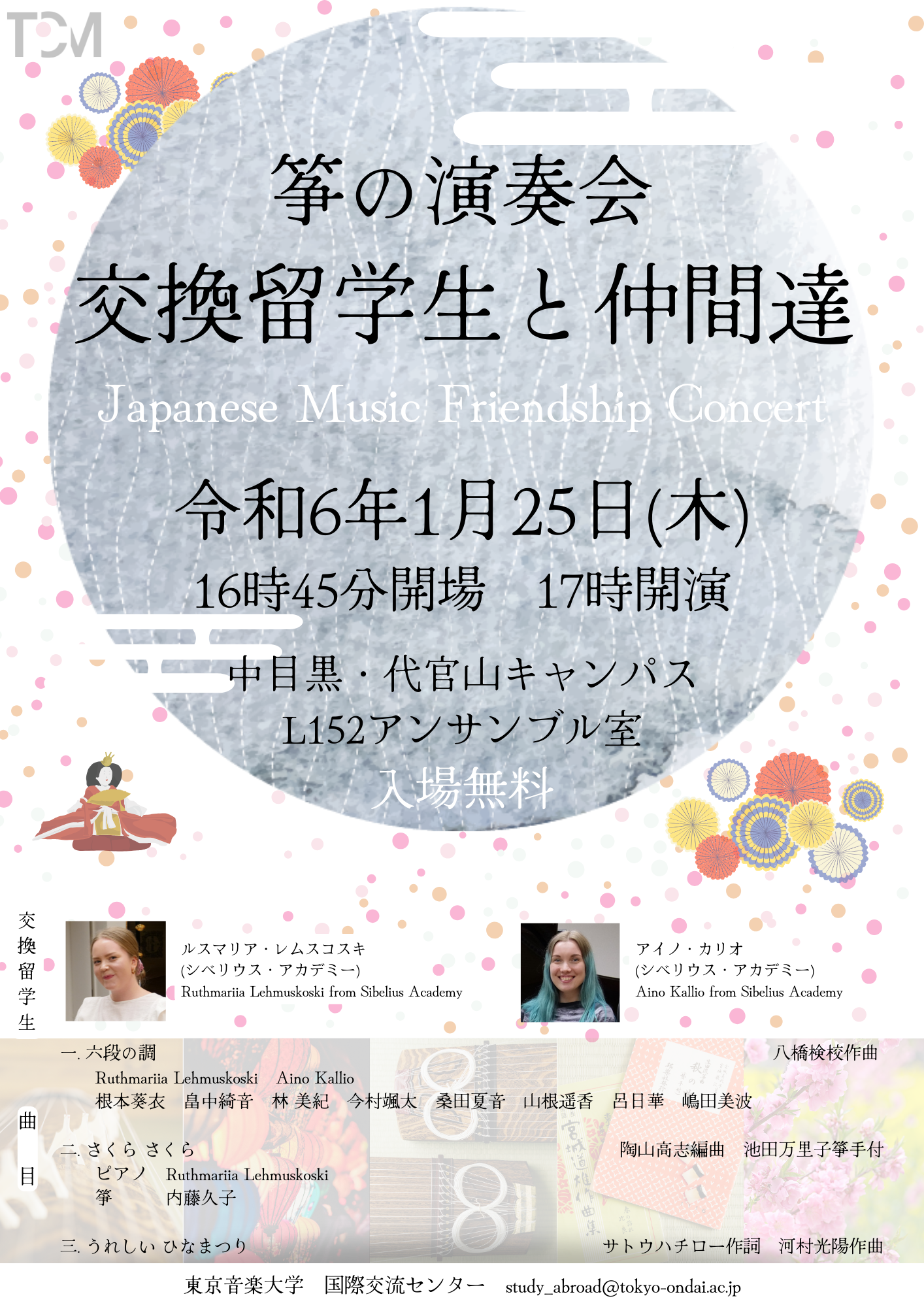 Exchange students from Sibelius Academy Ruthmariia and Aino collaborated with TCM students at a koto concert. After playing Rokudan no Shirabe (six-column tune), they performed Sakura Sakura (cherry blossoms) and Ureshii Hina Matsuri (happy Doll’s Day) to call the beautiful spring season in Japan.