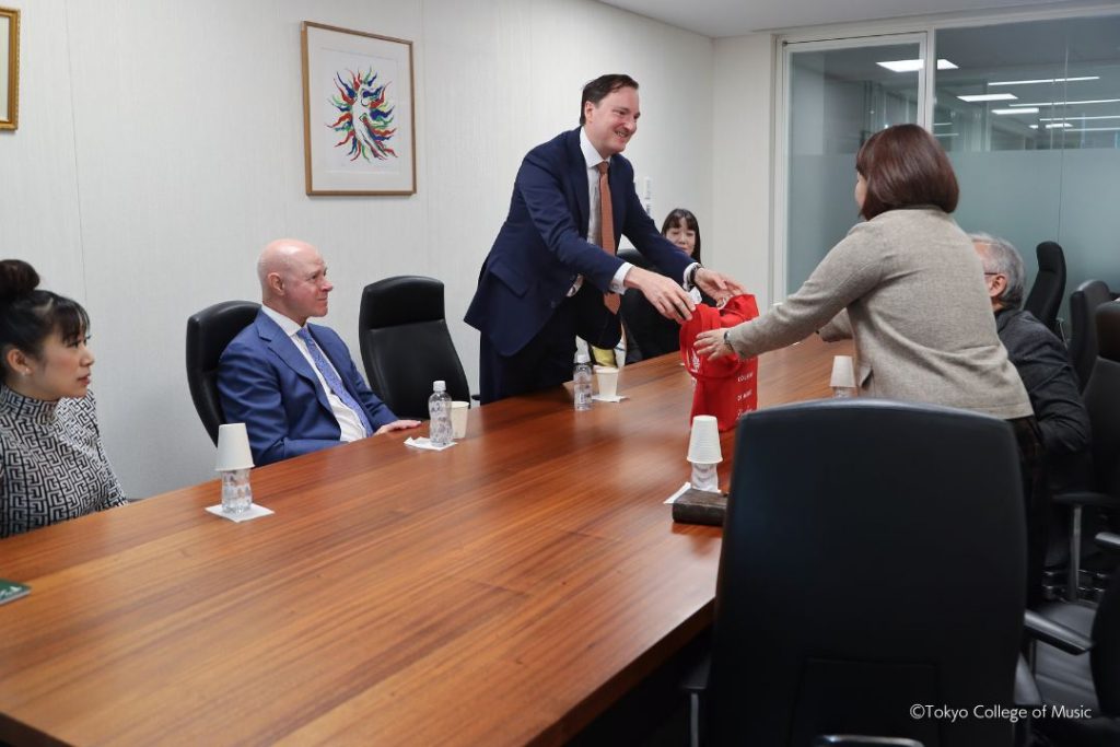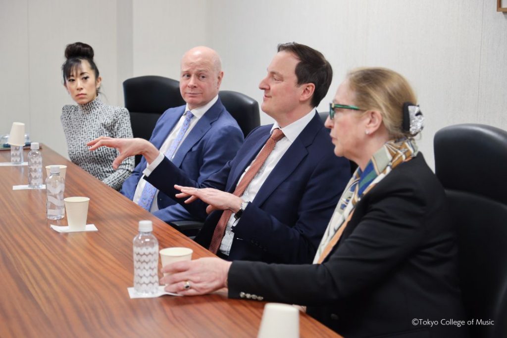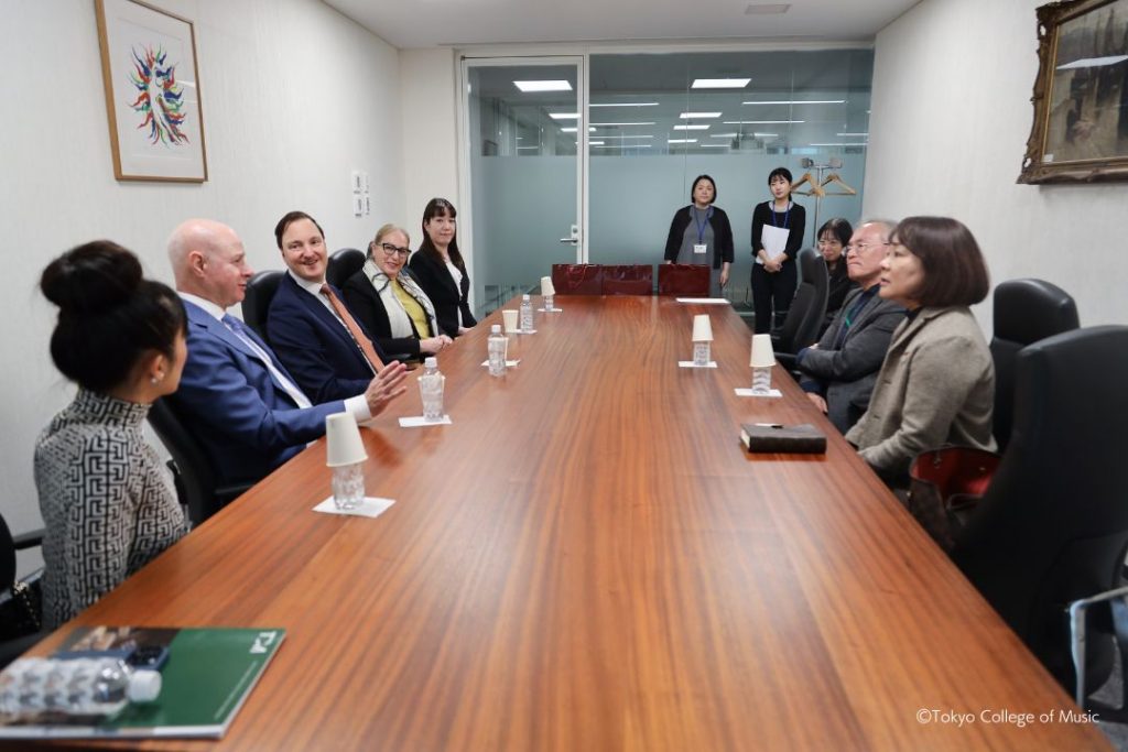 On November 11, 2025, Director James Williams, Deputy Director Kevin Porter, and Head of Keyboard and Associate Director for Partnerships in Asia of the RCM, Vanessa Latarche, made a courtesy visit to TCM. They discussed with our Vice President and Director of the Center of International Affairs, Noriko Ohtake, and the Head of the Piano Department, Katsunori Ishii.
