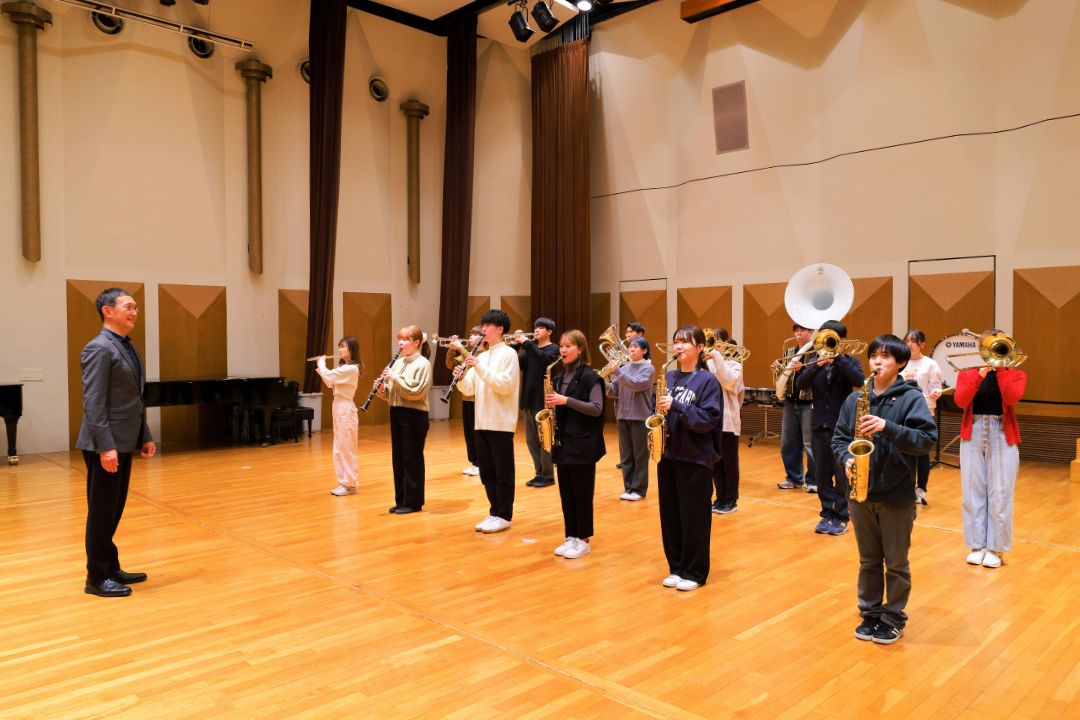 基礎合奏や楽曲の指導法、世代別の楽団の運営方法、吹奏楽と社会との関わり、合奏で使用される機器の操作方法や活用術、さらには著作権など、吹奏楽の現場に必要とされる知識を4年間で幅広く学びます。講師には学外からも実際に現場で活躍しているさまざまな方を招き、特定の方法論にとらわれず、多様なアプローチに触れていきます。また、4年次には実際にバンドを指揮して、合奏の組み立て方や振る舞い方なども学びます。