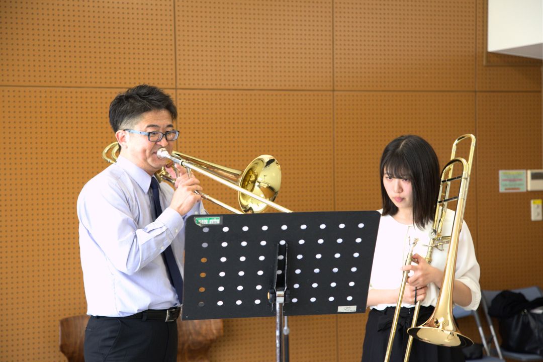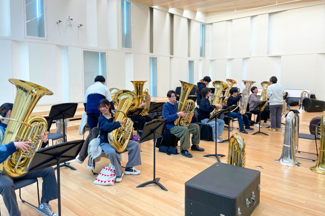 吹奏楽アカデミー専攻に所属する各楽器の専門家による指導のもと、木管・金管・打楽器・コントラバスと吹奏楽で使われるすべての楽器について学びます。自分たちで実際に楽器を手に取って演奏してみることを通じて、奏法はもちろん、各楽器の基礎知識から原理、メンテナンス方法、指導方法まで修得します。吹奏楽アカデミー専攻生のみが履修できる選択科目です。