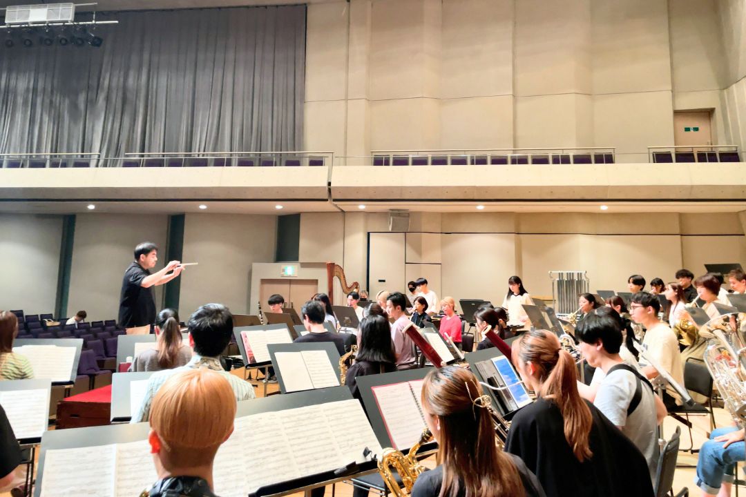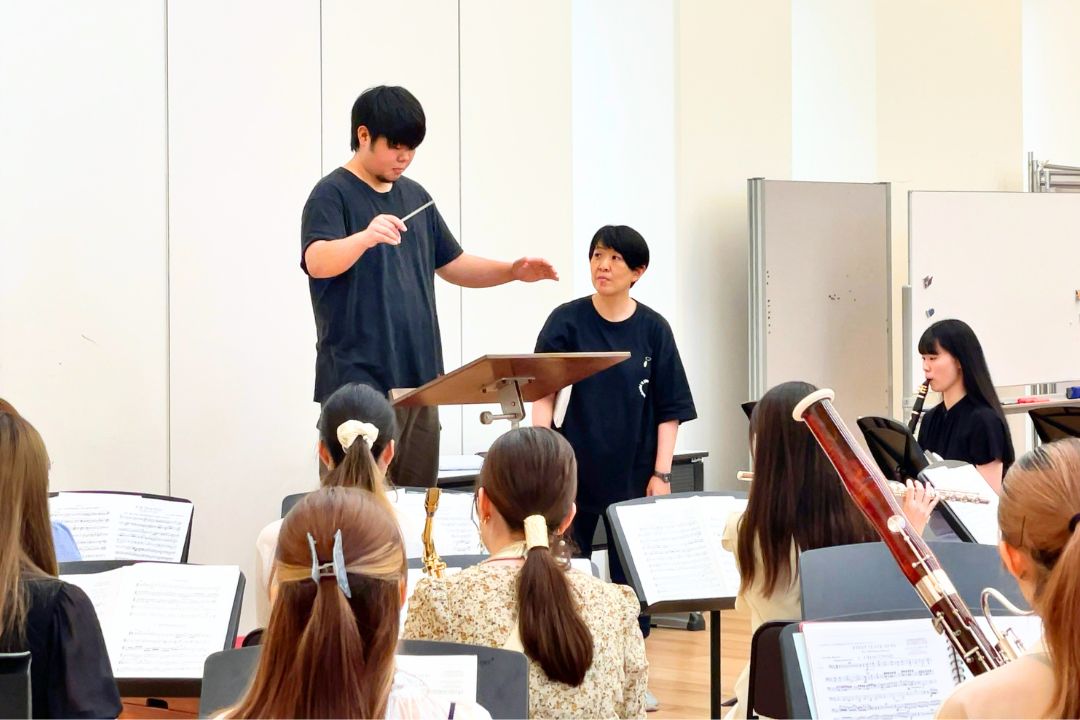 吹奏楽に何らかの形で携わる場合、指揮のスキルは絶対に必要となります。この授業では吹奏楽曲や管楽合奏の一種であるハルモニームジークの楽曲を用い、指揮の技術と表現法、合奏法を修得します。通常の授業ではピアノを用い、他の学生の楽曲を伴奏することで演奏者目線からも指揮法を学びます。また、各期末には実際にバンドも指揮します。吹奏楽アカデミー専攻生のみが履修できる選択科目です。(担当教員:下野竜也・小林恵子・横山奏)